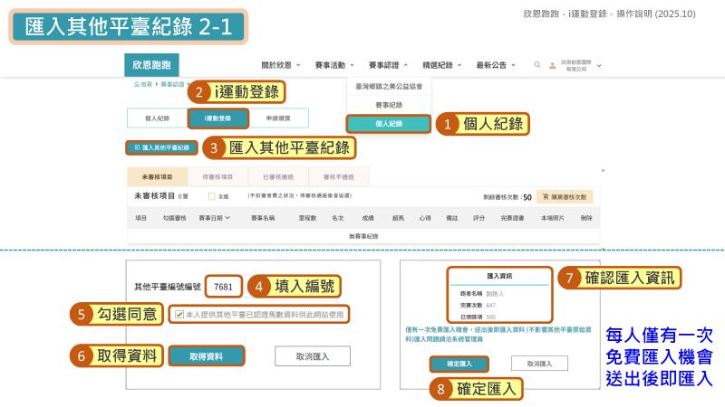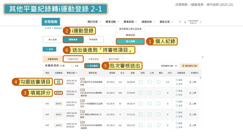 登入 > 個人紀錄 > i運動登錄 > 填寫賽事評分 > 勾選送審項目 > 批次審核送出 > 待審核項目